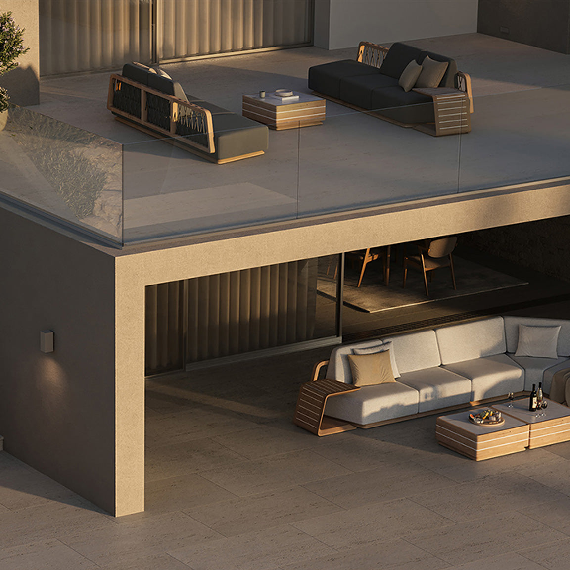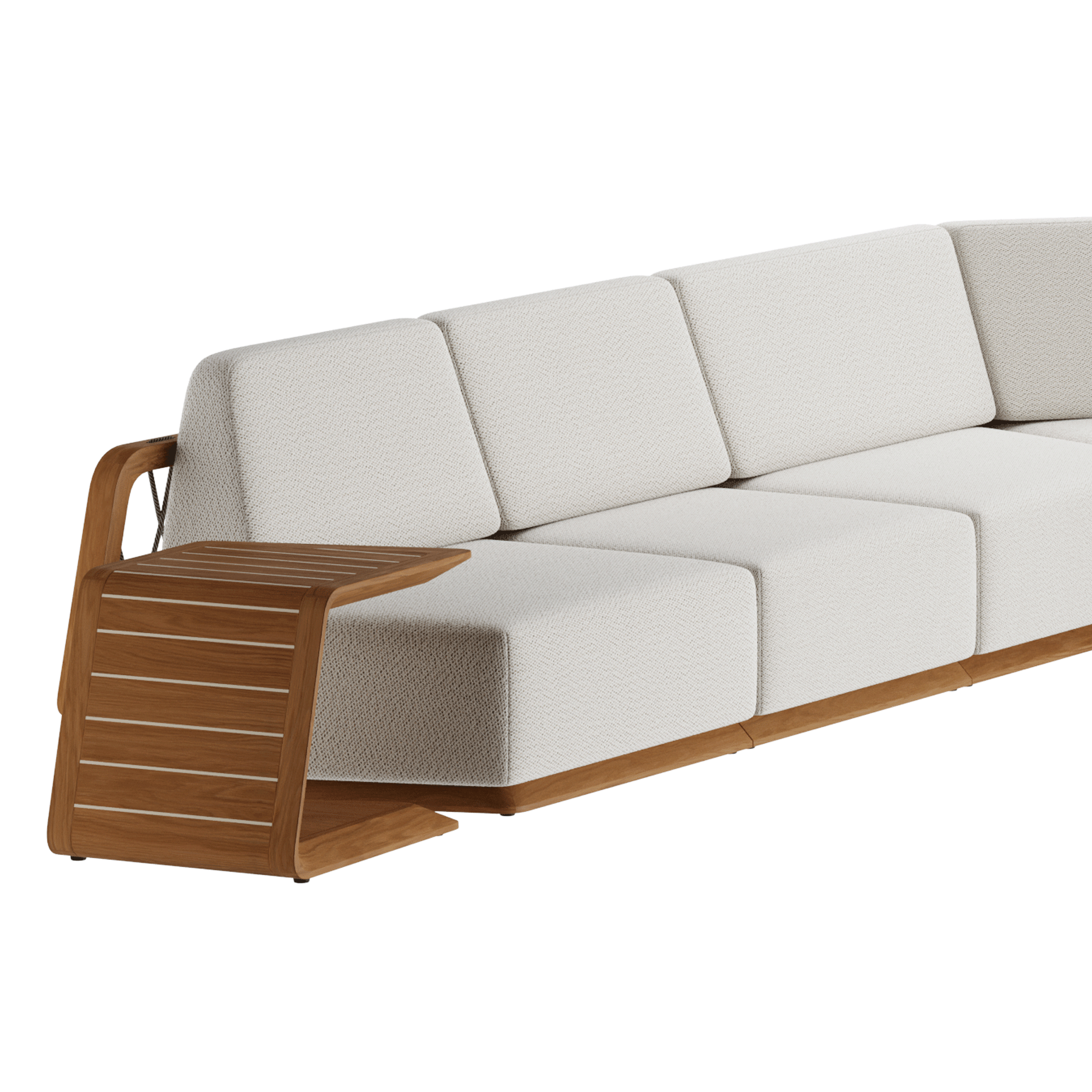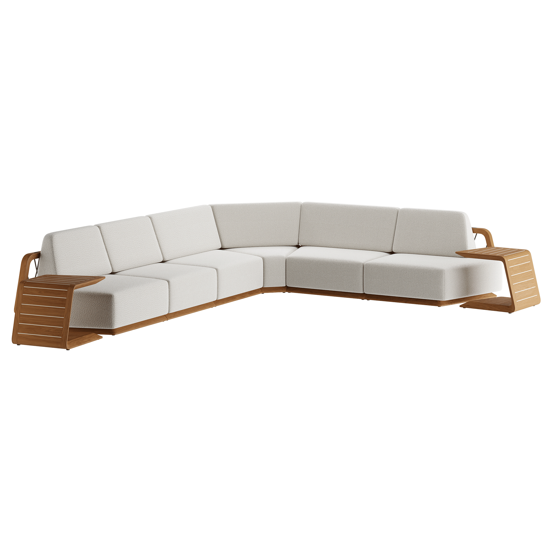 The frame of this N6 outdoor Corner Sofa showcases exceptional craftsmanship and attention to detail. Constructed from natural teak, the frame is carefully shaped with smooth rounded edges that enhance its contemporary aesthetic and comes with two beautifully crafted side tables. The backrest features an intricately woven rope design, adding a touch of texture and visual interest while ensuring sturdy support. This combination of luxury teak wood and rope not only creates a visually appealing contrast but also offers durability against outdoor elements. The integration of these high quality materials results in a sophisticated and resilient structure that complements the plush textured cushions, making it an ideal addition to any stylish outdoor setting.